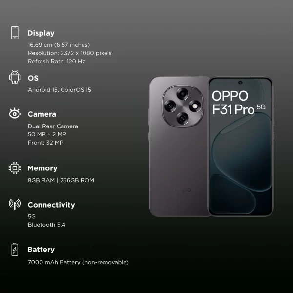OPPO F31 PRO 5G (8GB RAM + 128GB STORAGE) 6.57 inches FHD+ AMOLED | 7000mAh with 80W SUPERVOOC | Dimensity 7300-Energy | 360 Degree Armour Body | SuperCool VC System | AI Features | IP69 | (SPACE GREY)