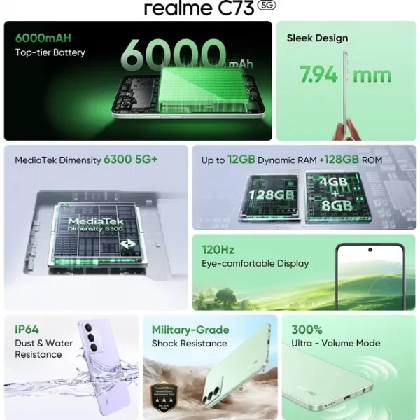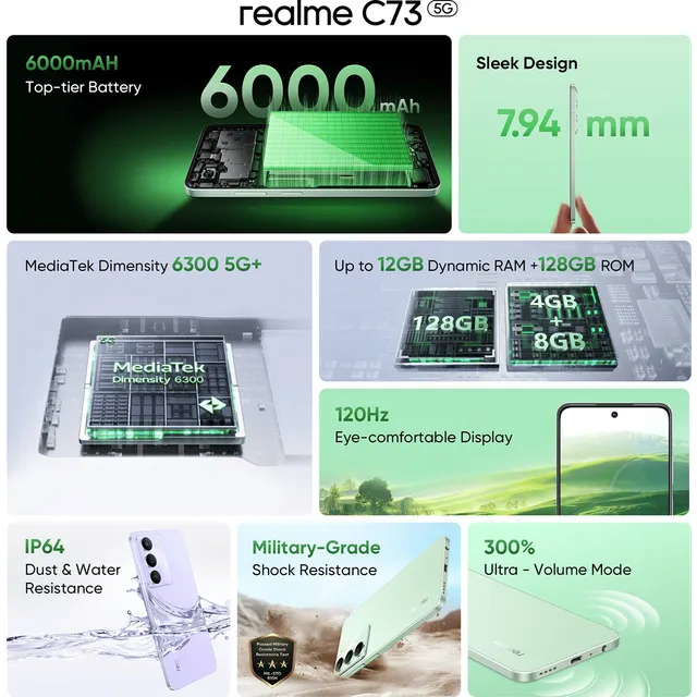 In The Box : realme C73 5G, USB Type-C Cable, 15W Adapter, Protect Case, SIM Card Needle, Screen Protect Film, Quick Guide