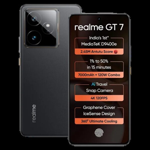 REALME GT7 (12GB RAM + 256GB STORAGE) | India’s 1st MediaTek D9400e Chipset | Strongest Battery Combo 7000mAh + 120W | AI 4K 120FPS Travel Camera | 360° Cooling IceSense Design with Graphene (ICESENSE BLACK)